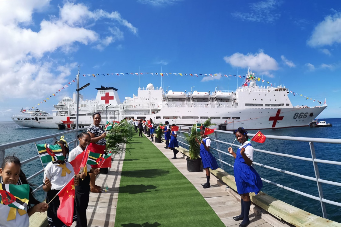 在多米尼克首都羅索,當(dāng)?shù)貙W(xué)生揮動(dòng)多中兩國(guó)國(guó)旗歡迎中國(guó)海軍和平方舟醫(yī)院船首次到訪(2018年10月12日攝)。