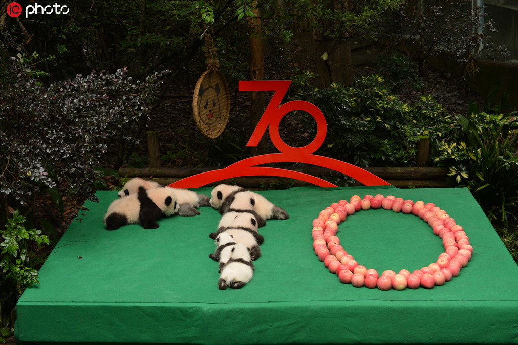 2019年9月24日,四川成都大熊貓繁育研究基地,7只新生大熊貓拼出“70”圖案,慶祝中華人民共和國成立70周年。