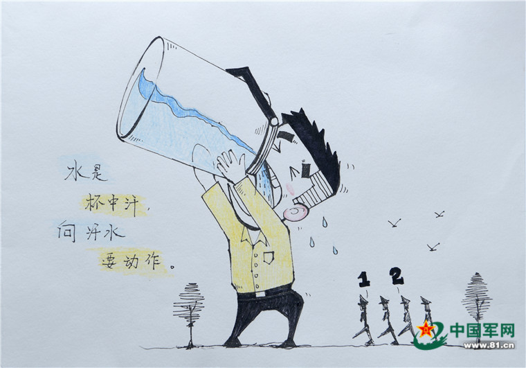前不久,聽說記者要來采訪他,杭瑞凱創(chuàng)作熱情更高了。近段時間以來,他利用業(yè)余時間又連續(xù)創(chuàng)作了“清涼一夏”“向汗水要動作”“三軍儀仗隊”等數(shù)十幅風趣幽默、主題鮮明的漫畫。他說:“筆墨釋放的是一種心情,記錄的是官兵生活,追求的是物我兩忘、天人合一,只要大家喜歡,就會筆耕不輟。”