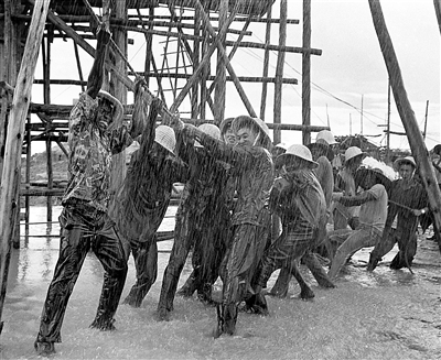 這是1973年,中國、坦桑尼亞、贊比亞工人、技術(shù)人員在一起冒雨趕修坦贊鐵路。新華社記者 李生南 攝