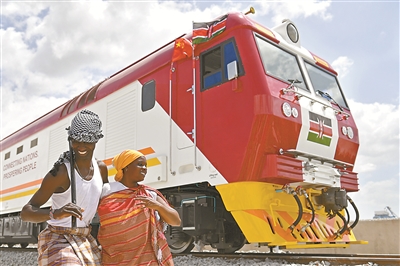 蒙內(nèi)鐵路是肯尼亞自獨立以來最大的基礎(chǔ)設(shè)施工程,項目累計為當?shù)刂苯觿?chuàng)造逾4.6萬個工作崗位。這是2017年1月11日,在肯尼亞蒙巴薩,當?shù)孛癖娫谥袊兄频拿蓛?nèi)鐵路首批內(nèi)燃機車旁載歌載舞。新華社記者 孫瑞博 攝