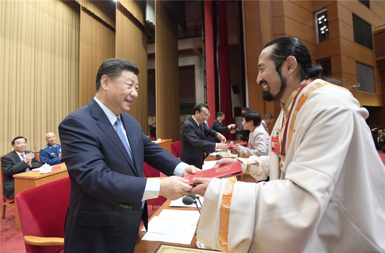 9月27日,全國(guó)民族團(tuán)結(jié)進(jìn)步表彰大會(huì)在北京舉行。這是習(xí)近平等向受表彰的模范集體和模范個(gè)人代表頒獎(jiǎng)。新華社記者 李學(xué)仁 攝