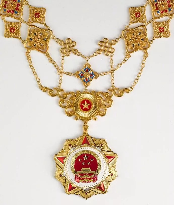 “共和國勛章”以紅色、金色為主色調(diào),章體采用國徽、五角星、黃河、長江、山峰、牡丹等元素,章鏈采用中國結、如意、蘭花等元素,整體使用冷壓成型、花絲鑲嵌、琺瑯等工藝制作,象征勛章獲得者為共和國建設和發(fā)展作出的巨大貢獻,禮贊國家最高榮譽,祝福祖國繁榮昌盛,寓意全國各族人民團結一心共筑中華民族偉大復興的中國夢。