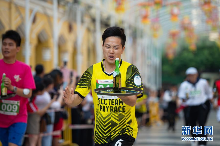 9月27日,在澳門議事亭前地,男子組參賽者在進行比賽。 當日,澳門旅游局舉行傳統(tǒng)托盤比賽慶祝世界旅游日,參賽者需單手托起有啤酒的托盤,從大三巴走到議事亭前地。 新華社記者 張金加 攝