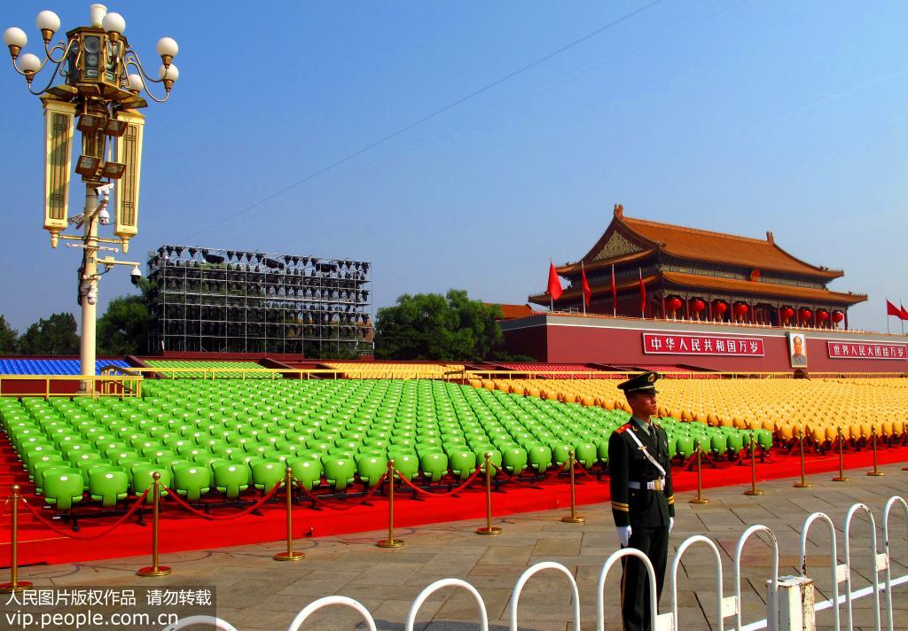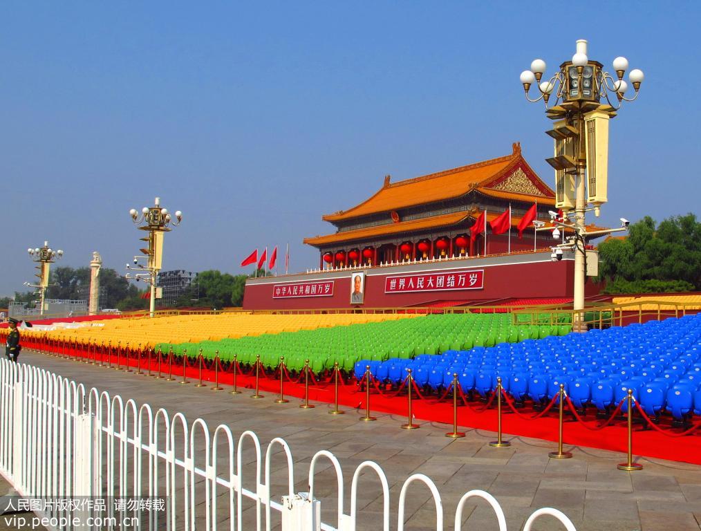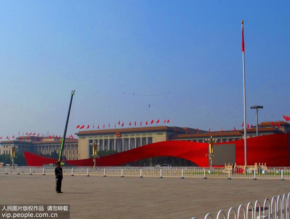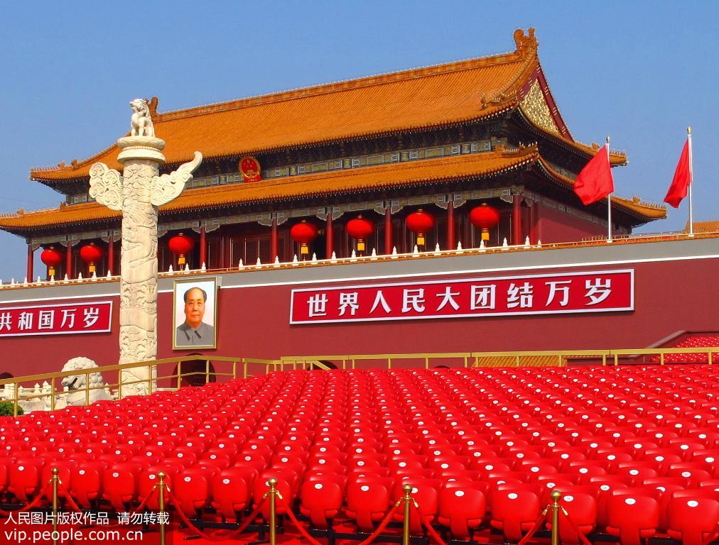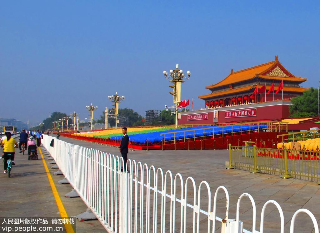 2019年9月29日,天安門廣場呈現(xiàn)壯觀美麗的景致,在天安門前臨時(shí)觀禮臺絢麗多彩,天安門城樓上掛上大紅燈籠、金水橋上鋪上了紅色地毯與廣場上紅色飄帶造型相互輝映,天安門廣場正以壯麗的景致迎接慶典的到來。(徐經(jīng)來/人民圖片)
