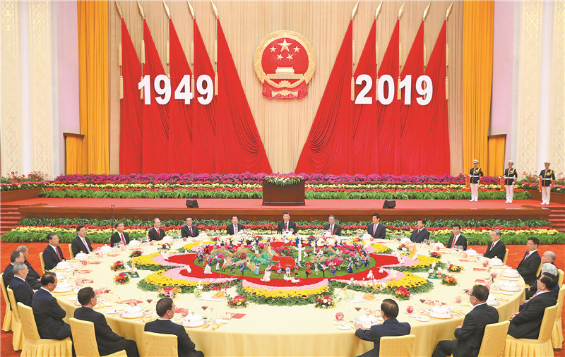 在喜慶歡快的樂曲聲中,中外賓朋舉杯共賀中華人民共和國成立70周年,祝福中國繁榮富強,祝愿中國同世界各國友誼長青,共創(chuàng)幸福美好未來。