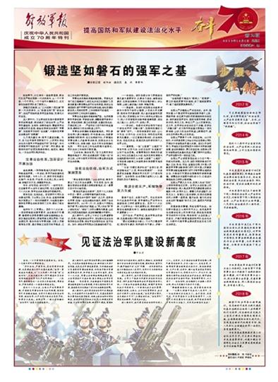 回望來路自慷慨,再赴征程氣如虹。站在新中國成立70周年的節(jié)點上,身后是我軍法治建設(shè)征途上的光輝足跡,眼前是實現(xiàn)強軍目標的時代召喚,唯有保持“永遠在路上”的姿態(tài),才能不斷提高國防和軍隊法治化水平,為新時代強軍事業(yè)提供更加堅實有力的法治保證。請關(guān)注今日《解放軍報》的報道——