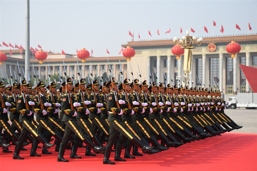 10月1日上午,慶祝中華人民共和國(guó)成立70周年大會(huì)在北京天安門廣場(chǎng)隆重舉行。這是國(guó)旗護(hù)衛(wèi)隊(duì)從人民英雄紀(jì)念碑基座出發(fā),走向旗桿基座。新華社記者 費(fèi)茂華 攝