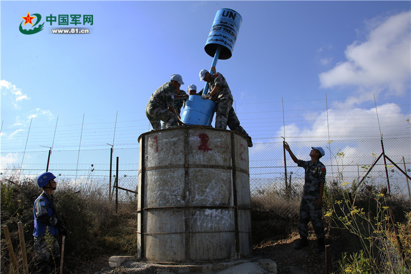 維和工人在施工,官兵說,這個藍桶相當于國家與國家之間的分界線,也就是一般意義上說的——停火線(圖/馬騫)