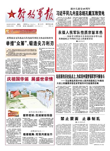 習(xí)主席在慶祝中華人民共和國成立70周年大會上指出:“中國人民解放軍和人民武裝警察部隊要永葆人民軍隊性質(zhì)、宗旨、本色,堅決維護國家主權(quán)、安全、發(fā)展利益,堅決維護世界和平。”習(xí)主席的重要講話,站在為國家謀富強、為人民謀幸福、為民族謀復(fù)興的高度,對人民軍隊的性質(zhì)宗旨、職能使命作出了深刻闡述,為新時代全軍官兵不忘初心、牢記使命、接續(xù)奮斗提供了思想航標(biāo)和行動指南。受閱部隊精彩出色的表現(xiàn),集中宣示了人民軍隊永遠聽黨指揮的鮮明立場,集中展示了新時代國防和軍隊建設(shè)發(fā)展的輝煌成就,集中彰顯了人民軍隊捍衛(wèi)國家主權(quán)、安全、發(fā)展利益的決心實力。