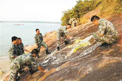 上圖:官兵正在制作海灘“書畫”。胡祖海攝