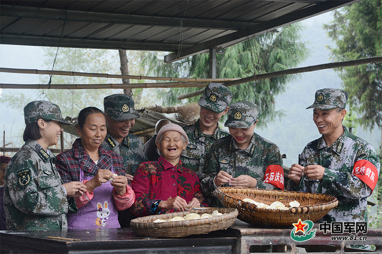 重慶涪陵區(qū)人武部民兵扶貧隊(duì)隊(duì)員來到貧困戶羅德安家里一同包餃子,魚水情深,其樂融融。(黃春紅 攝)