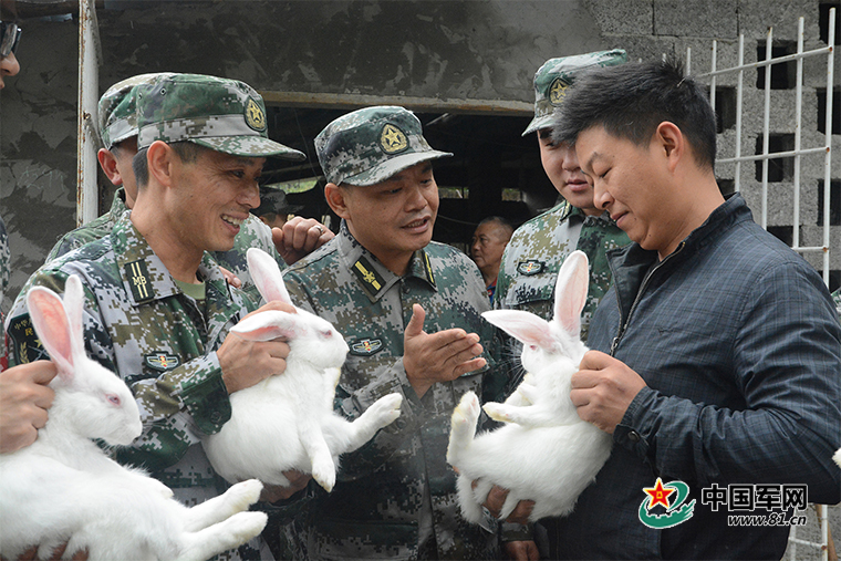 重慶涪陵區(qū)人武部民兵扶貧隊隊員在土井村與村民交流肉兔養(yǎng)殖經(jīng)驗,助力養(yǎng)殖致富。(黃春紅 攝)