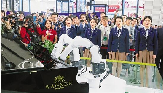 博覽會開幕式前,工業(yè)機器人演奏名曲《茉莉花》。記者 倪雁強 攝