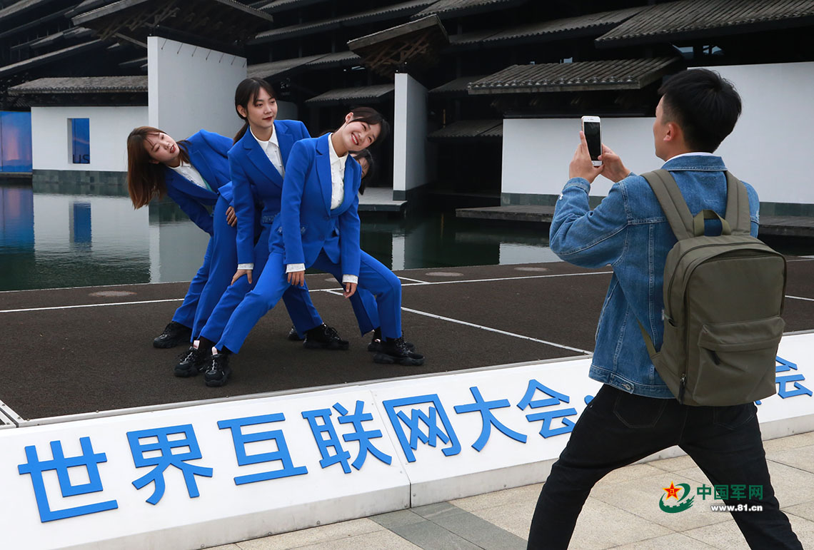 身著工作服的世界互聯(lián)網(wǎng)大會志愿者合影留念。