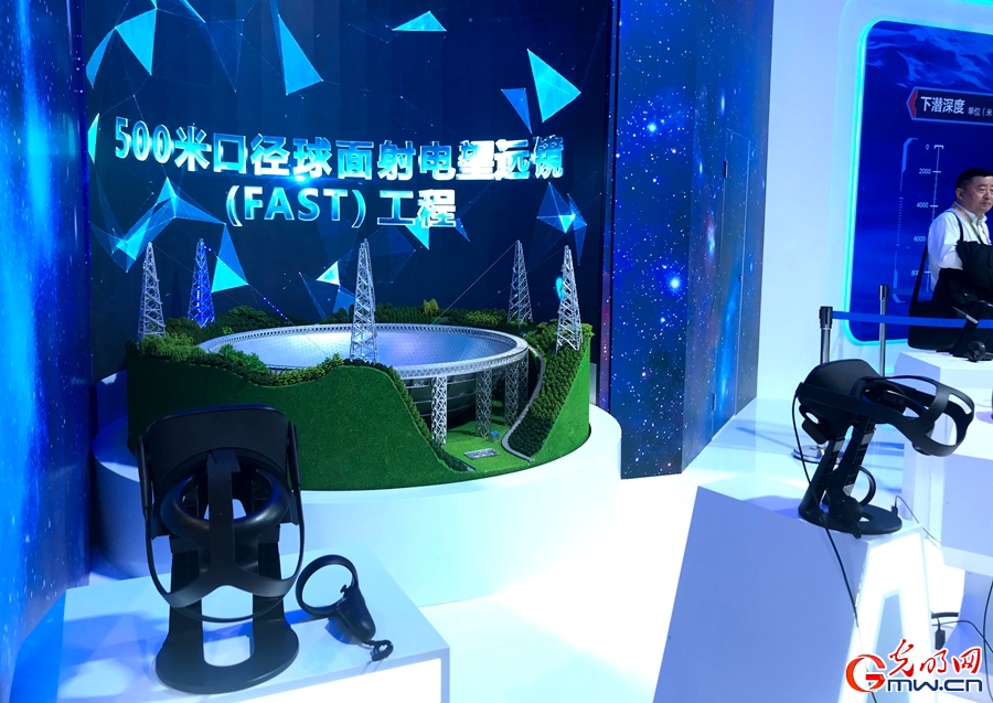 相隔不遠(yuǎn)的500米口徑球面射電望遠(yuǎn)鏡(簡稱FAST)展示同樣精彩。FAST望遠(yuǎn)鏡展示裝置看上去小小的,一旦戴上了VR眼睛,或許你就能看見光年之外的脈沖星。