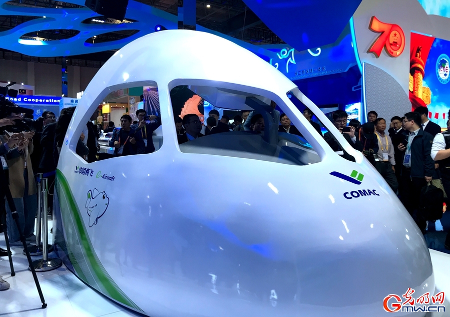 在中國館主入口左側(cè),中國商飛的未來電氣化飛機(jī)虛擬集成平臺(tái)尤為引人注目。不僅在展示板上,C919、CR929、ARJ21等國產(chǎn)飛機(jī)共同演繹“闊步新時(shí)代、共襄藍(lán)天夢”,現(xiàn)場還把C919的飛機(jī)頭“搬”到了展館,不少參觀者在操作臺(tái)上互動(dòng)體驗(yàn)。