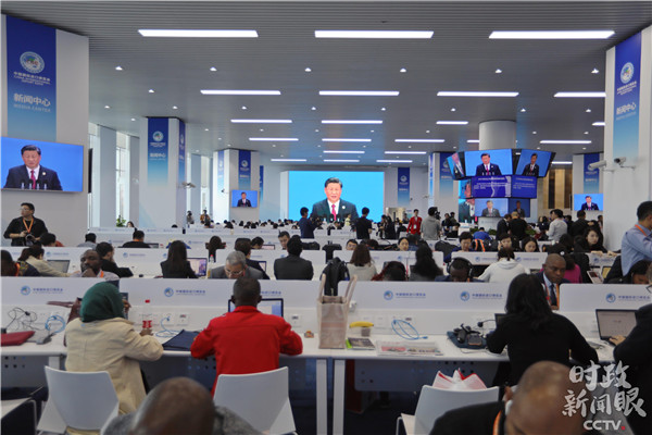 △各國記者正在新聞中心關注習主席的主旨演講。(央視記者魏幫軍拍攝)