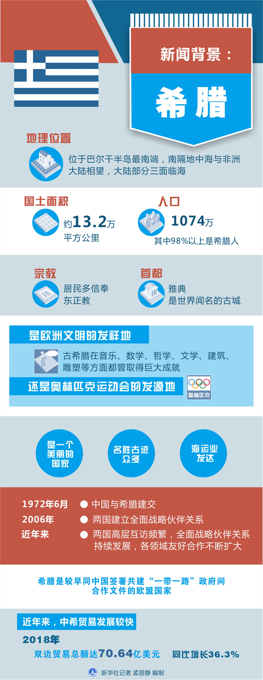 中國與希臘1972年6月建交。2006年,兩國建立全面戰(zhàn)略伙伴關系。近年來,兩國高層互訪頻繁,全面戰(zhàn)略伙伴關系持續(xù)發(fā)展,各領域友好合作不斷擴大。希臘是較早同中國簽署共建“一帶一路”政府間合作文件的歐盟國家。近年來,中希貿(mào)易發(fā)展較快。2018年,雙邊貿(mào)易總額達70.64億美元,同比增長36.3%。
