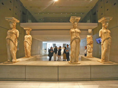他們走到二層的少女廊柱前,仰望凝視。少女廊柱原本屬于衛(wèi)城的伊瑞克提翁神廟。經(jīng)歷兩千多年歲月滌蕩,眼前的雕塑依然紋路精美、線條富有動(dòng)感。令人遺憾的是,一組6個(gè)少女廊柱并不完整,其中一個(gè)因遭受掠奪而流落海外。
