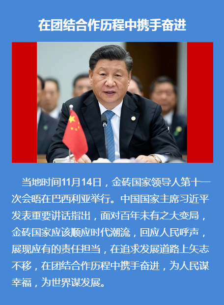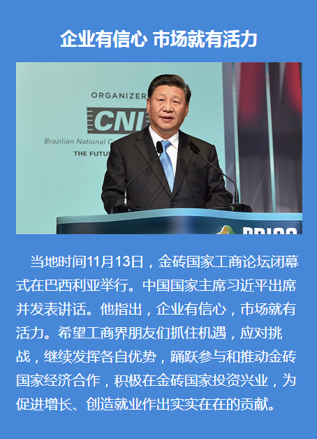 當(dāng)?shù)貢r(shí)間11月13日至14日,金磚國(guó)家工商論壇閉幕式、金磚國(guó)家領(lǐng)導(dǎo)人第十一次會(huì)晤在巴西首都巴西利亞舉行。中國(guó)國(guó)家主席習(xí)近平出席并發(fā)表重要講話。