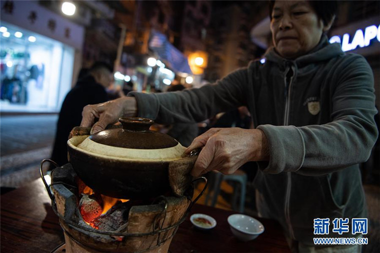 12月3日,在位于澳門新馬路關前街街口的“強記羊腩煲”,員工在忙碌。傳統(tǒng)的炭火爐與瓦煲邊食邊煮,羊肉色澤油潤且軟嫩無膻味,加入支竹、粉腸、蘿卜、魚頭及生菜,口感更豐富。這款冬日里的限定美食不容錯過。 新華社記者 張金加 攝