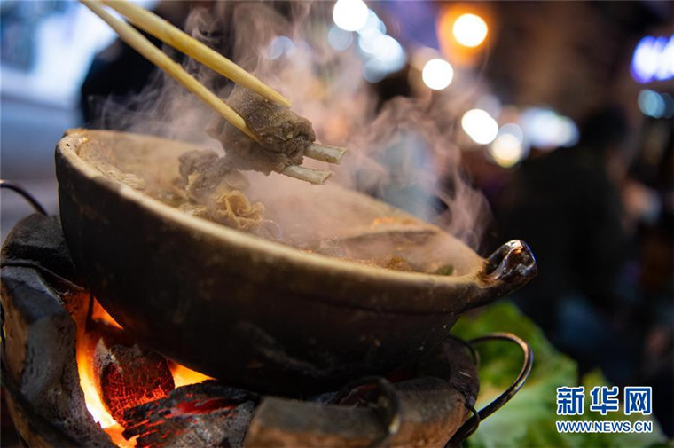 12月3日,在位于澳門新馬路關前街街口的“強記羊腩煲”,客人品嘗美食。傳統(tǒng)的炭火爐與瓦煲邊食邊煮,羊肉色澤油潤且軟嫩無膻味,加入支竹、粉腸、蘿卜、魚頭及生菜,口感更豐富。這款冬日里的限定美食不容錯過。 新華社記者 張金加 攝