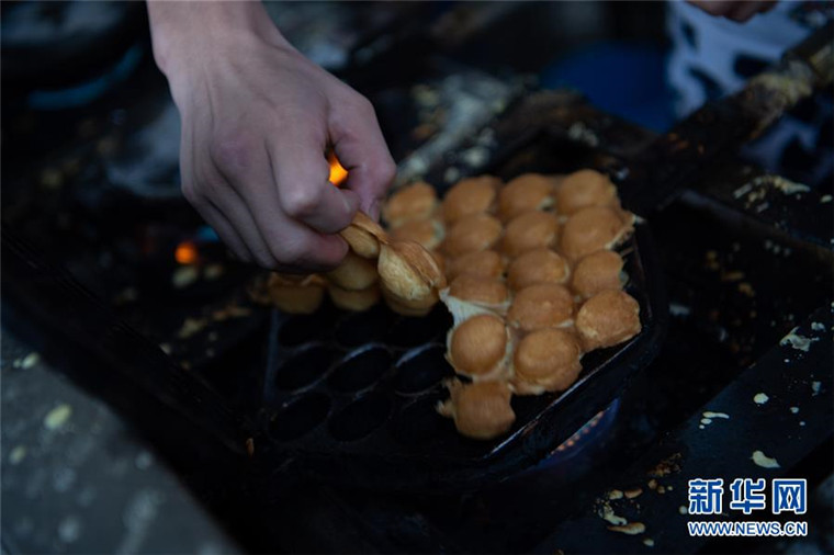 11月20日在位于澳門大堂斜巷的“興二”車仔檔拍攝的制作中的雞蛋仔。新鮮出爐的雞蛋仔蛋味濃郁、香脆可口,可以選擇加醬料、煉奶或花生醬。在美食林立的澳門,雞蛋仔是澳門特色小食中的經(jīng)典代表。 新華社記者 張金加 攝