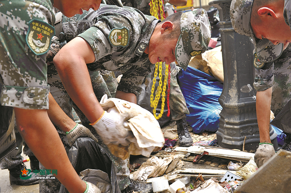 2017年8月,在超強臺風“天鴿”襲擊澳門后開展的救災(zāi)行動中,駐澳門部隊官兵清理街區(qū)垃圾。