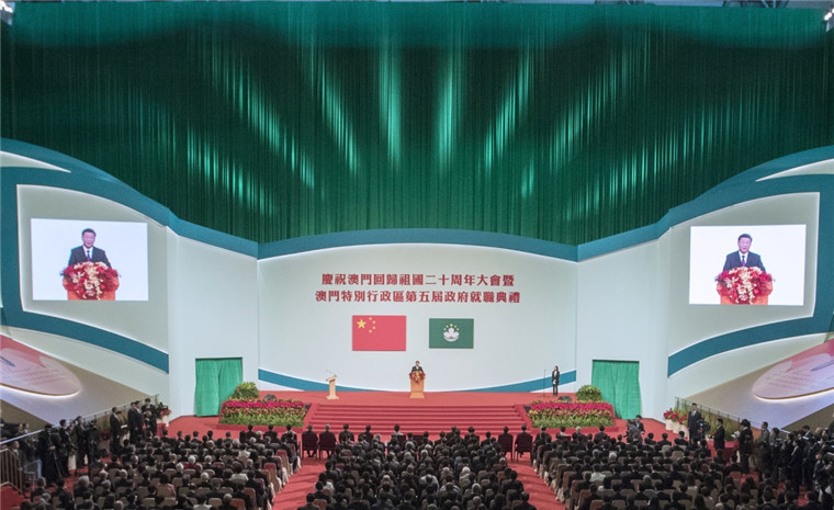 12月20日,慶祝澳門回歸祖國20周年大會暨澳門特別行政區(qū)第五屆政府就職典禮在澳門東亞運(yùn)動(dòng)會體育館隆重舉行。中共中央總書記、國家主席、中央軍委主席習(xí)近平出席并發(fā)表重要講話。新華社記者 黃敬文 攝