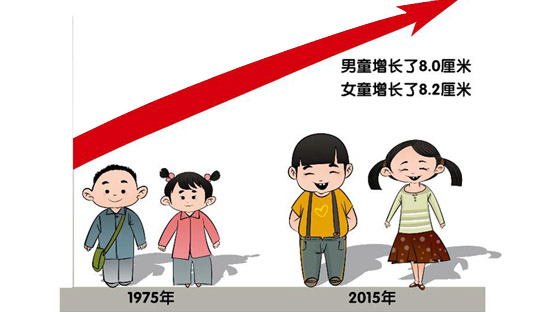 從1975年到2015年,我國兒童身高、體重指標(biāo)均持續(xù)快速增長。以最具代表性的5到5.5歲年齡組為例,男童和女童身高分別增長了8.0厘米和8.2厘米。身高