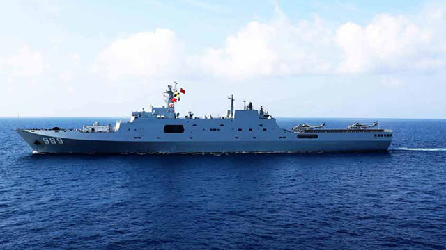 我國自行研制設(shè)計產(chǎn)的新型綜合登陸艦 ,配備有新型艦炮系統(tǒng)、近程火炮系統(tǒng)和干擾裝置,能在除極區(qū)以外的任何海區(qū)安全航行。