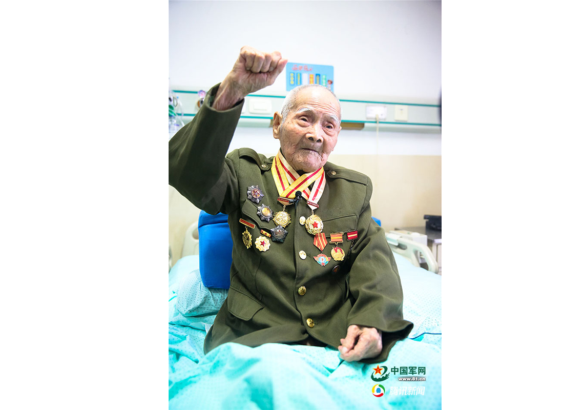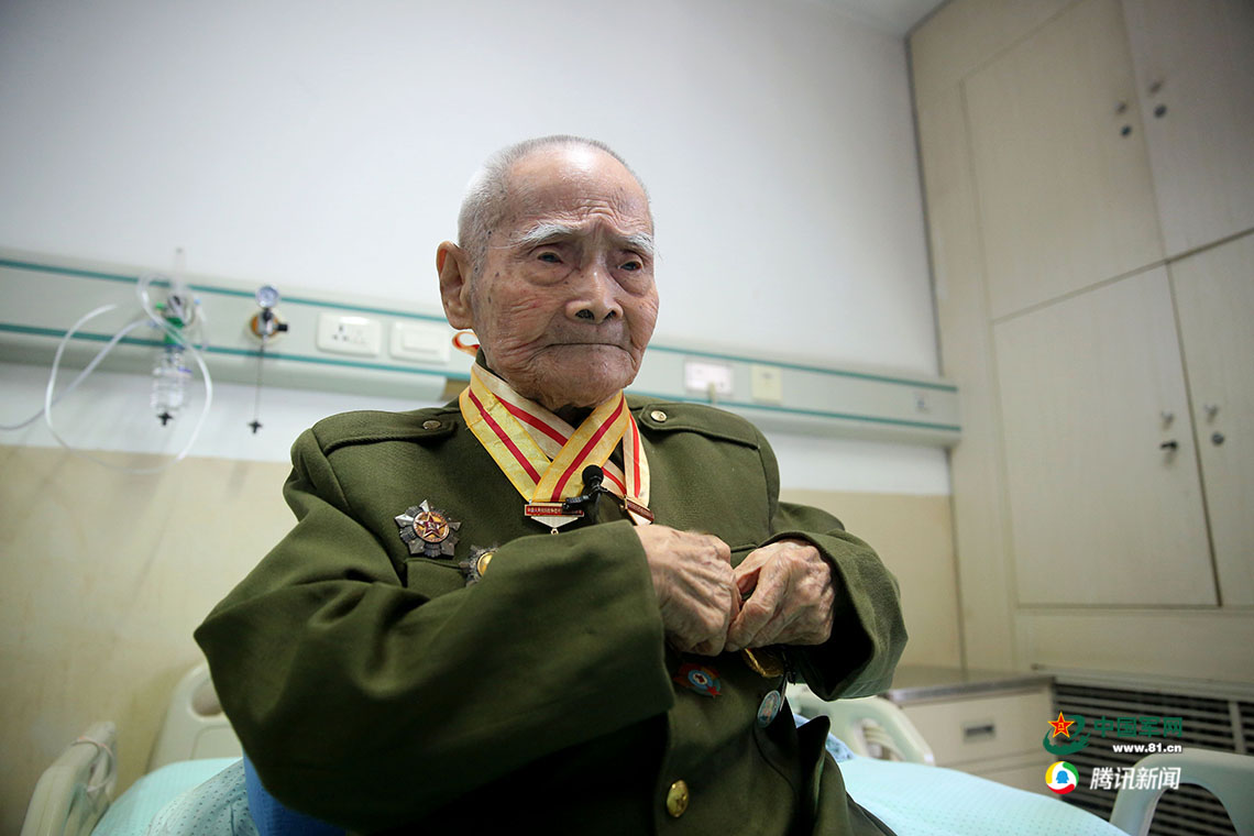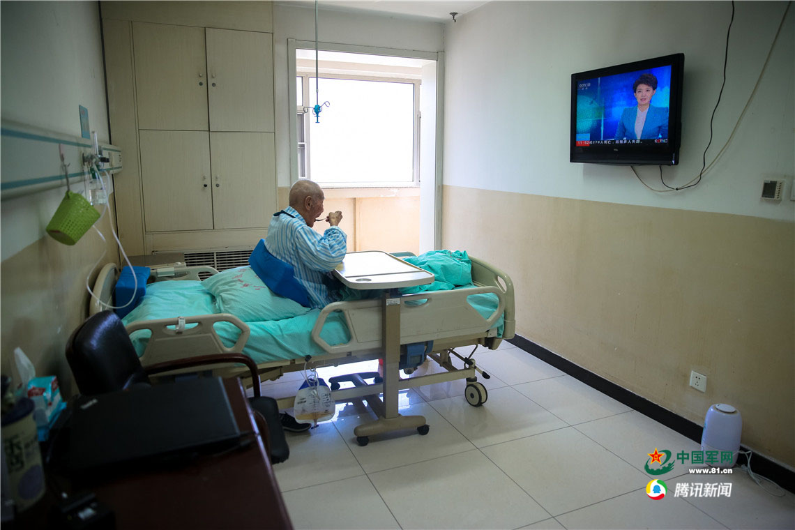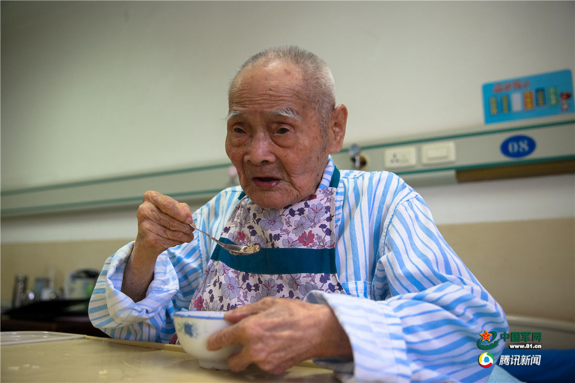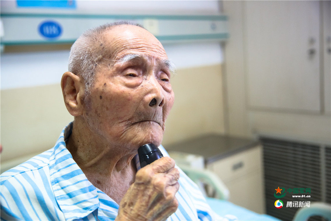 今年已有101歲高齡的顧老身體虛弱,需常年住院。他因為右腿打仗時受過槍傷,現(xiàn)在很少下地走動,生活起居幾乎都在病床上。照顧他的大兒子顧京輝說,顧老雖是百歲老人,但是很少麻煩醫(yī)護人員和家人,堅持自己吃飯,自己刮胡子,最喜歡唱《游擊隊之歌》。記者一行趕往醫(yī)院看望顧老時,老人正半躺在病床上比劃著太極拳的動作。一聽到記者來,他像招呼老朋友一樣揮起了手。