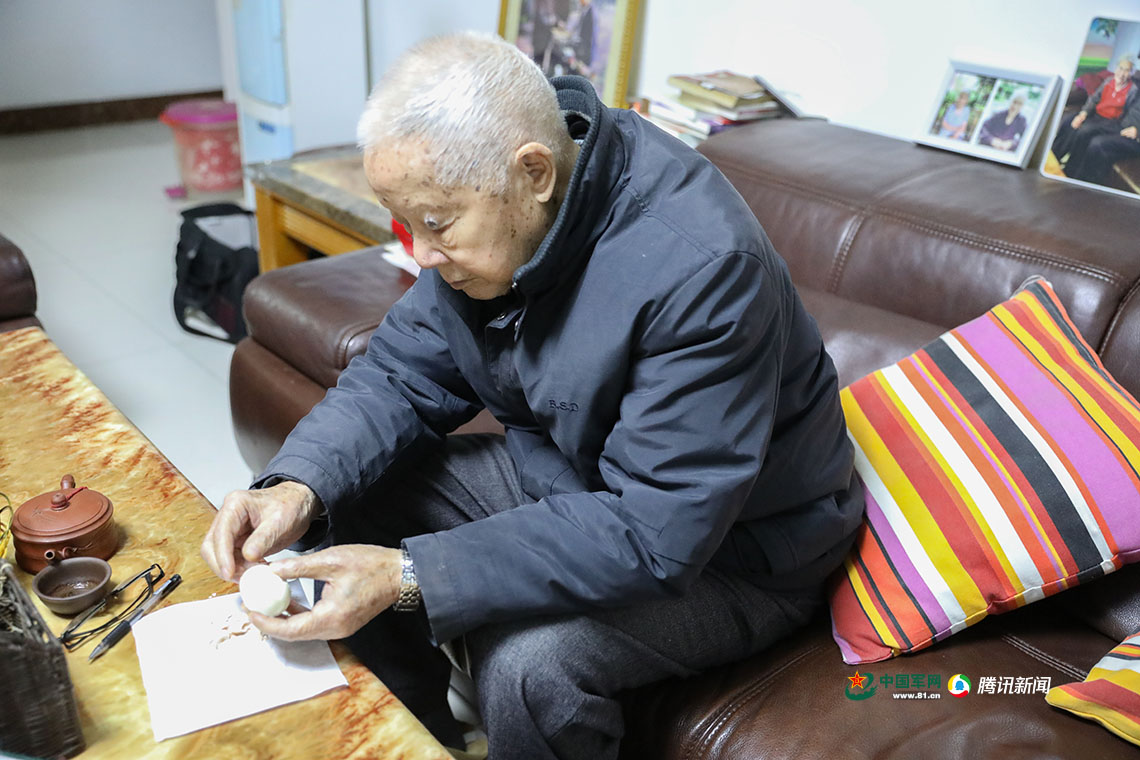 鳳玉奎在吃雞蛋,他剝蛋殼時(shí)手依然很靈敏。中國(guó)軍網(wǎng)記者伍行健 攝