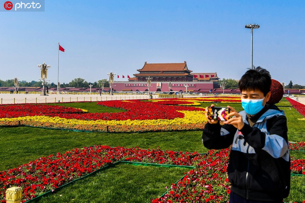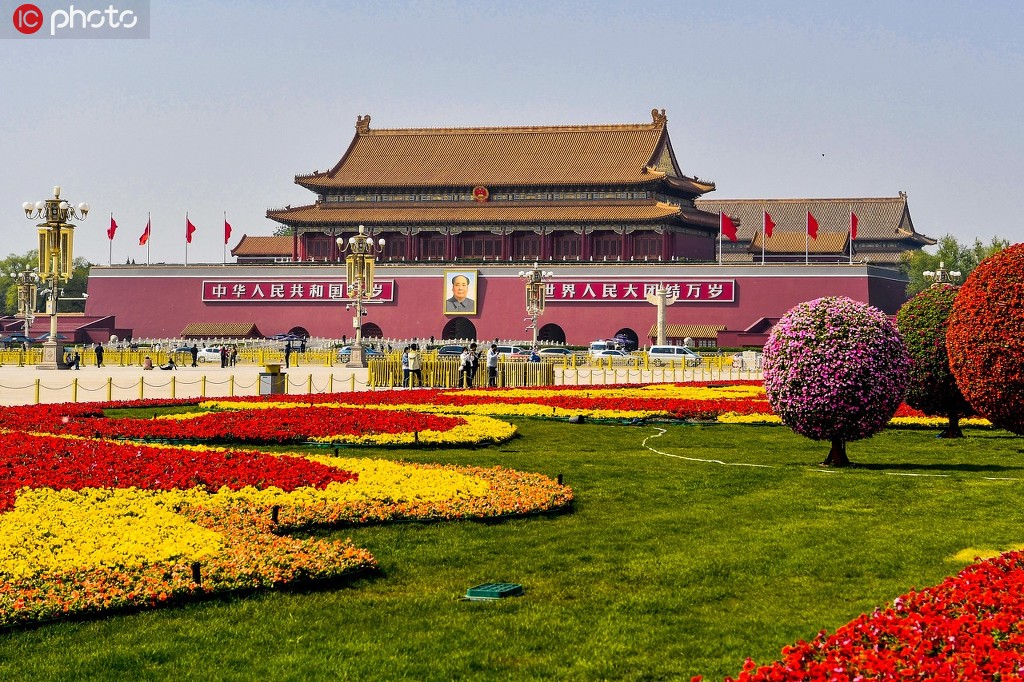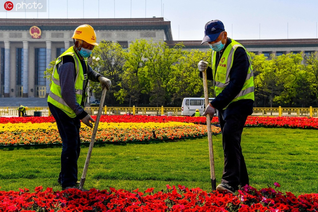 2020年4月28日,北京天安門(mén)廣場(chǎng)布置花壇,迎接五一勞動(dòng)節(jié)。李山澤/IC photo