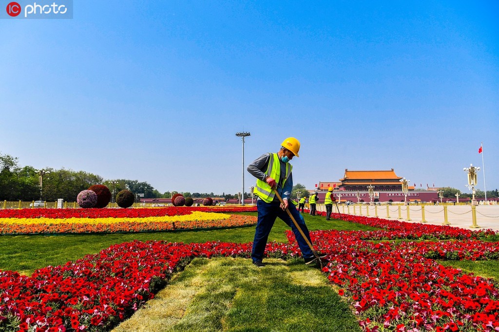2020年4月28日,北京天安門廣場布置花壇,迎接五一勞動節(jié)。李山澤/IC photo