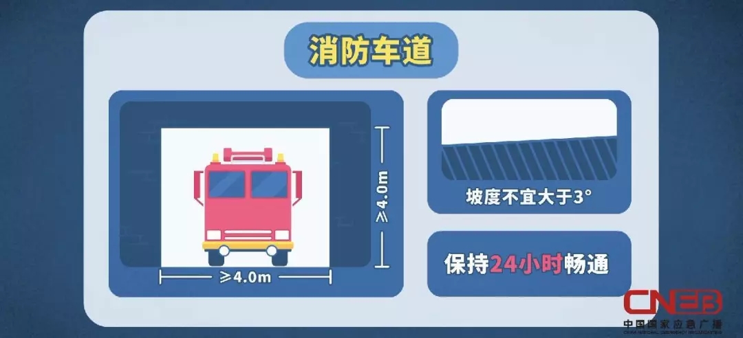 法律明確規(guī)定,消防通道不僅要嚴(yán)格按照規(guī)定配備,而且不得堵塞。消防車道的寬度和高度均不應(yīng)小于4米、停車的坡度不應(yīng)大于3°、并保持24小時(shí)暢通。