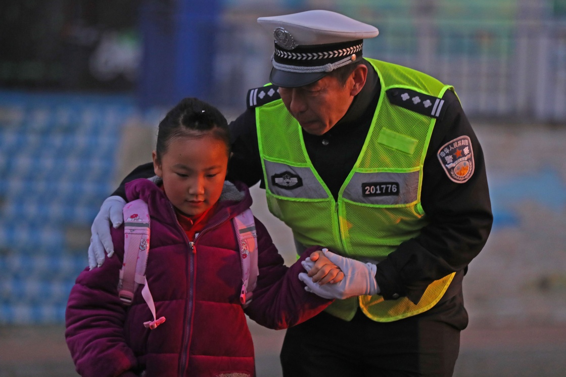 1月3日,楊傳峻在大連市旅順口區(qū)迎春小學(xué)門口護(hù)送學(xué)生上學(xué)。新華社記者 楊青 攝