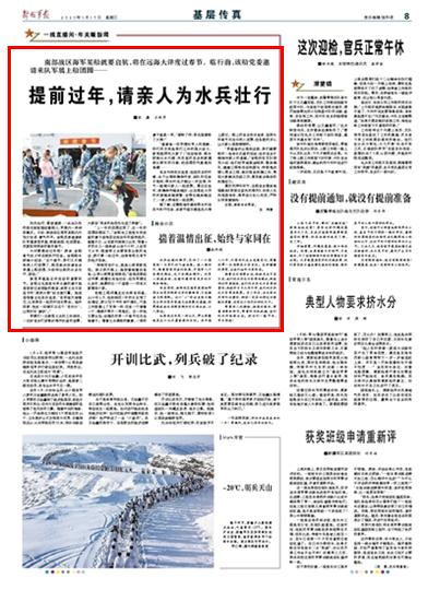 揣著這份溫情出征,縱使走出千里萬里,我們的水兵也不會感到遙遠;縱使闖過驚濤駭浪,我們的水兵也不會感到害怕;縱使終日與大洋為伴,我們的水兵也不會感到寂寞。多少年后,當這些水兵回憶往事時,相信一定會記得這次特殊的團圓,還有這個陽光燦爛的日子。