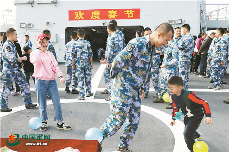 為何要提前過年呢?原來,該船春節(jié)前夕將啟航執(zhí)行任務。該船船長舒濤介紹說:“這個春節(jié),我們又不能和親人們團聚了,船黨委決定請官兵親屬上船團圓,為即將出航的水兵壯行、鼓勁。”