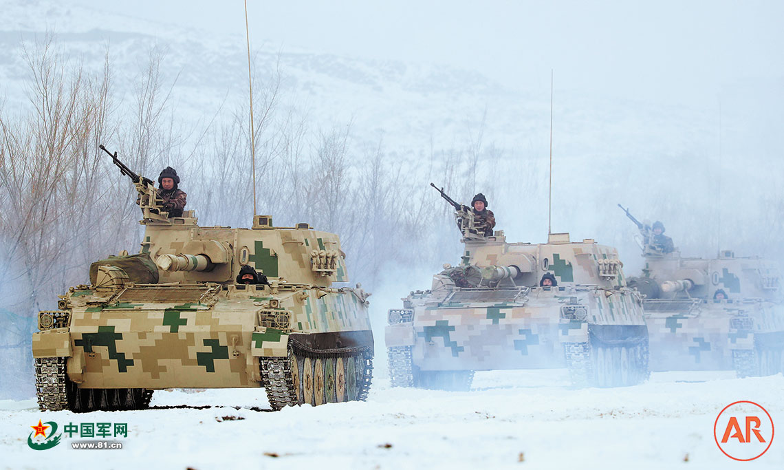 1月13日,新疆軍區(qū)某裝甲團(tuán)組織裝甲裝備進(jìn)行冰雪地機(jī)動行軍訓(xùn)練。