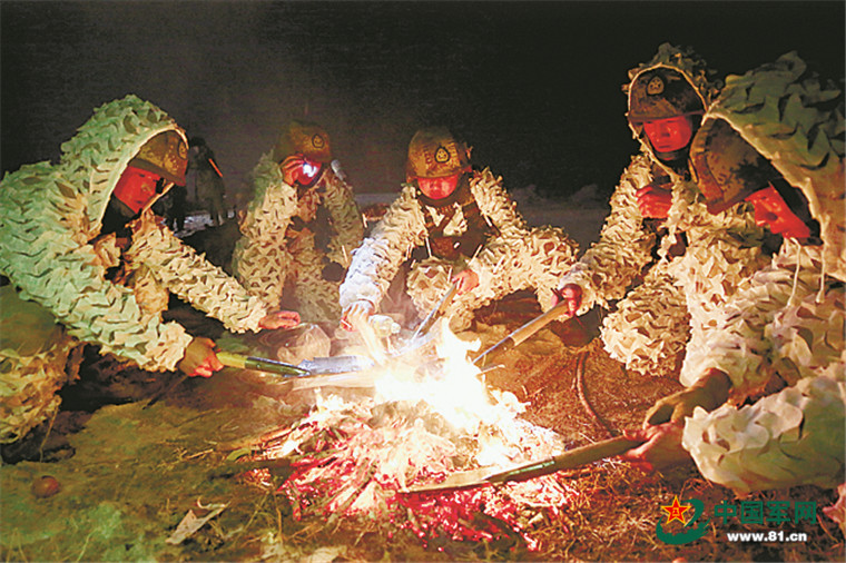 冬季夜間野炊,戰(zhàn)士們自己動手,飯菜飄香。
