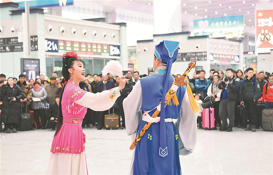 1月10日,在合肥南站候車大廳,安徽演藝集團(tuán)和省文聯(lián)組織的文藝小分隊(duì)為南來(lái)北往的乘客送上“文化年貨”。