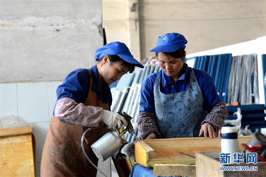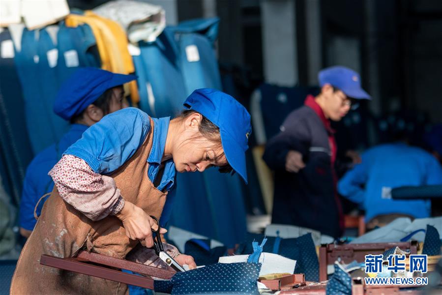 梁桂枝(左)在車間幫助姐姐梁桂蘭修補(bǔ)座墊(2019年12月10日攝)。新華社發(fā)(孫赟飛攝)