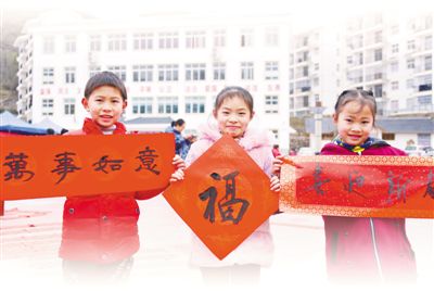湖北恩施土家族苗族自治州宣恩縣的小朋友們展示春聯(lián)。王俊攝(人民視覺)