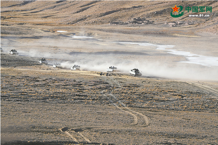 海拔4700米的高原峽谷間,數(shù)輛坦克與步戰(zhàn)車交替掩護(hù)、狂飆突進(jìn),像一支支鋼鐵利劍,刺向“敵”軍陣地,卷起漫天沙塵。