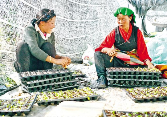 近年來,白朗縣發(fā)展蔬菜產(chǎn)業(yè),助力214戶貧困戶、1029人脫貧致富。圖為1月23日,在日喀則珠峰現(xiàn)代農(nóng)業(yè)科技創(chuàng)新博覽園蔬菜大棚里,當?shù)貏展と藛T在培育萵筍苗。新華社記者 張汝鋒 攝