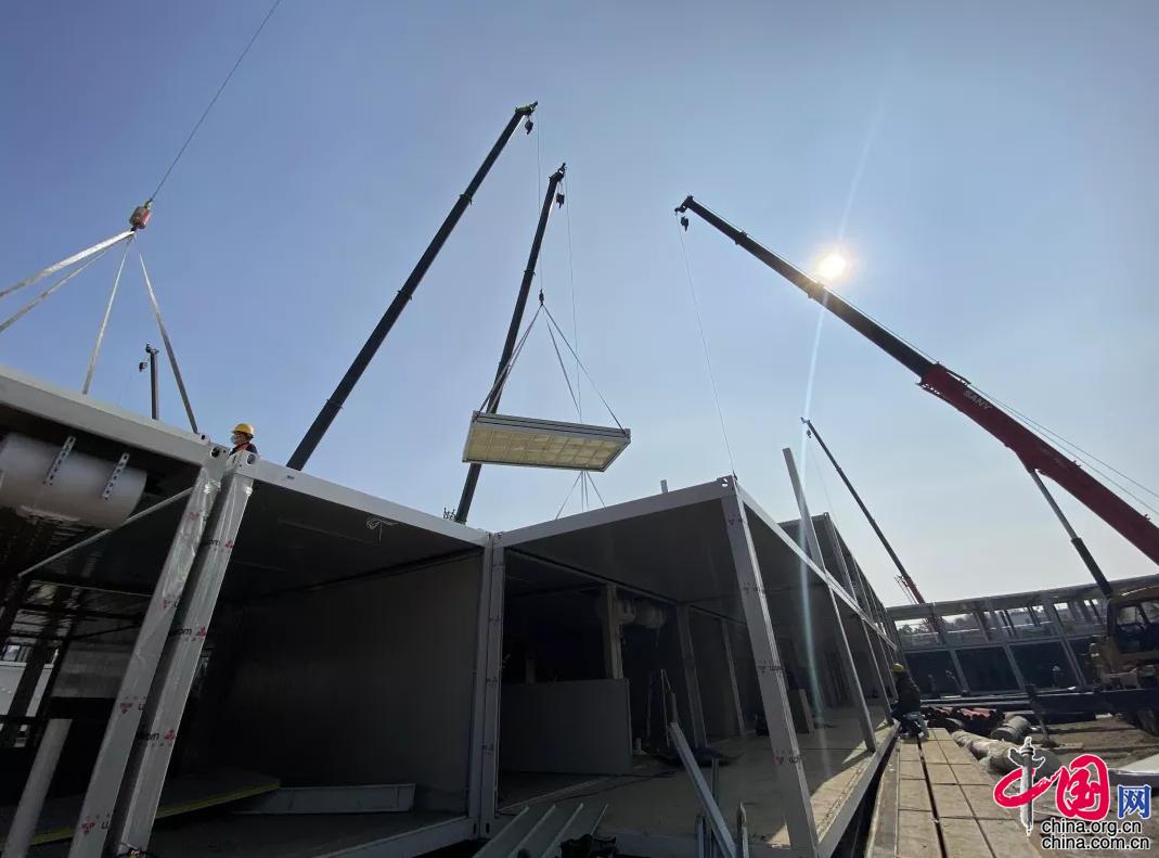 隔離病房區(qū)箱式板房現(xiàn)場吊裝完成30間