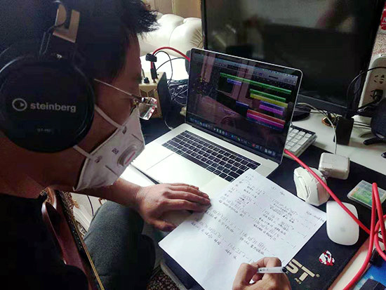杭錦旗烏蘭牧騎隊員劉洋在創(chuàng)作歌曲《英雄》。受訪者供圖