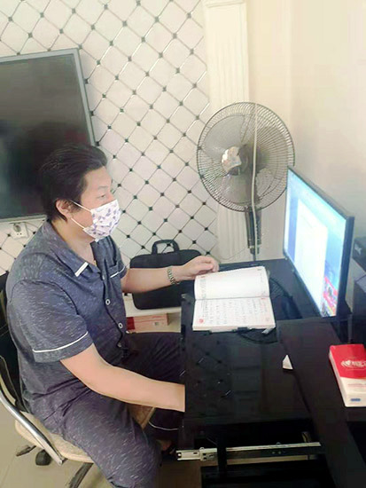 喀喇沁旗烏蘭牧騎隊長吳國輝在家中創(chuàng)作快板作品《為逆行者點贊》。受訪者供圖